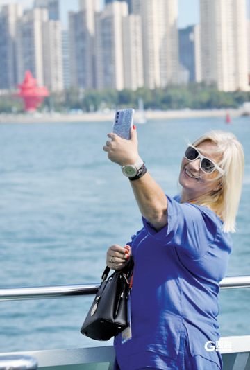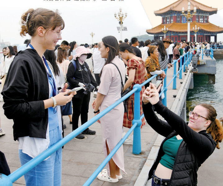 青岛多次上榜“入境游十大热门目的地”等榜单。图为外国游客在青岛海边打卡。