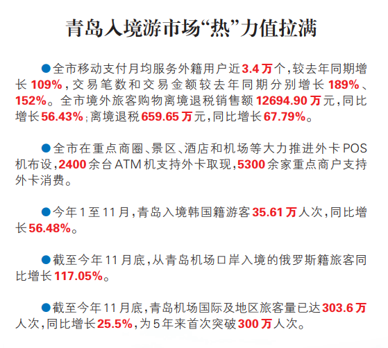 1至11月青岛空港入境游客56.71万人次,同比增长44.99%;全市移动支付月均服务外籍用户较去年同期增长109%