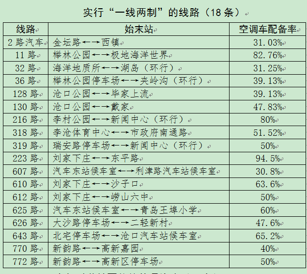 对混合开行空调车与普通车的18条公交线路,实行“一线两制”政策,空调车实行季节性票价,普通车仍执行原票价政策不变;对全部配备空调车的80条公交线路调整为季节性空调线路,实行季节性票价;对9条常年空调线路,调整为季节性空调线路,实行季节性票价;对仍保留的隧道公交等常年空调线路,因客观原因尚未配备空调车,以及空调车不能开启空调运行的,执行普通车票价。