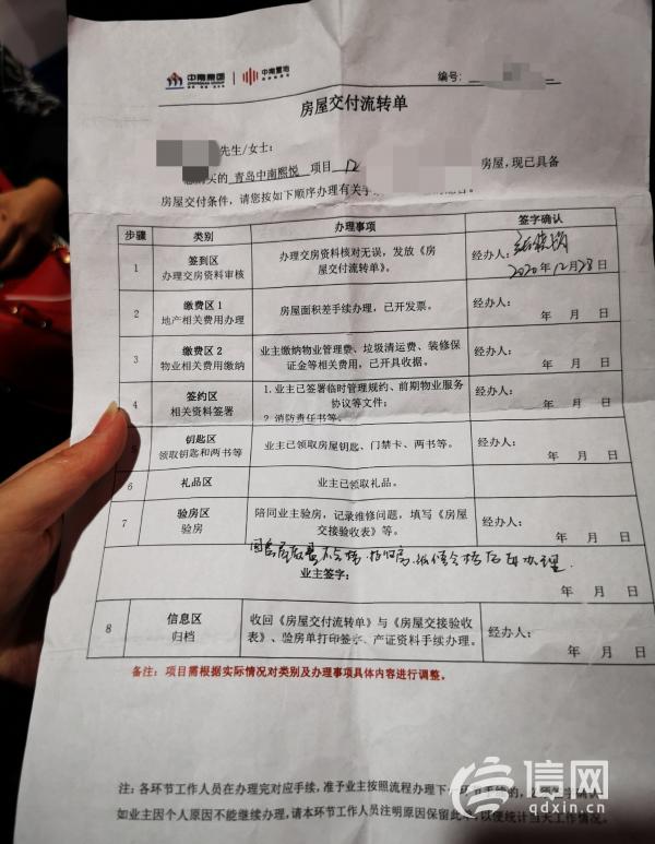 王女士告诉信网,中南世纪城四期的业主,看到房屋出现的这些问题,并不同意收房,但开发商现在却让业主们强制收房。“验房的时候开发商给了一张房屋交付流转单让业主签字,当时我们都没有同意签字,在上面写了因房屋质量不合格拒收房,可开发商却说业主只要去验了房就算收房,我们现在连房屋钥匙都没有,咋就强制收房了呢?”